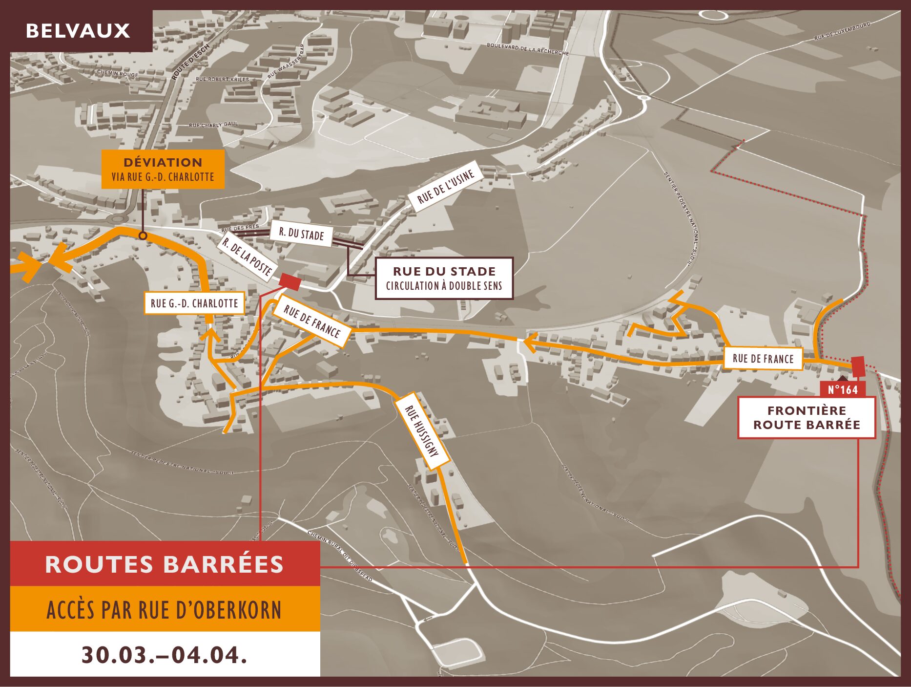 En raison de la configuration de la rue Grande-Duchesse Charlotte – rue de la Gare et de la charge de trafic de transit journalière en provenance de la France, la rue de France sera barrée à toute circulation à la hauteur de la frontière (maison n°164). La rue du Stade sera quant à elle ouverte à double sens.