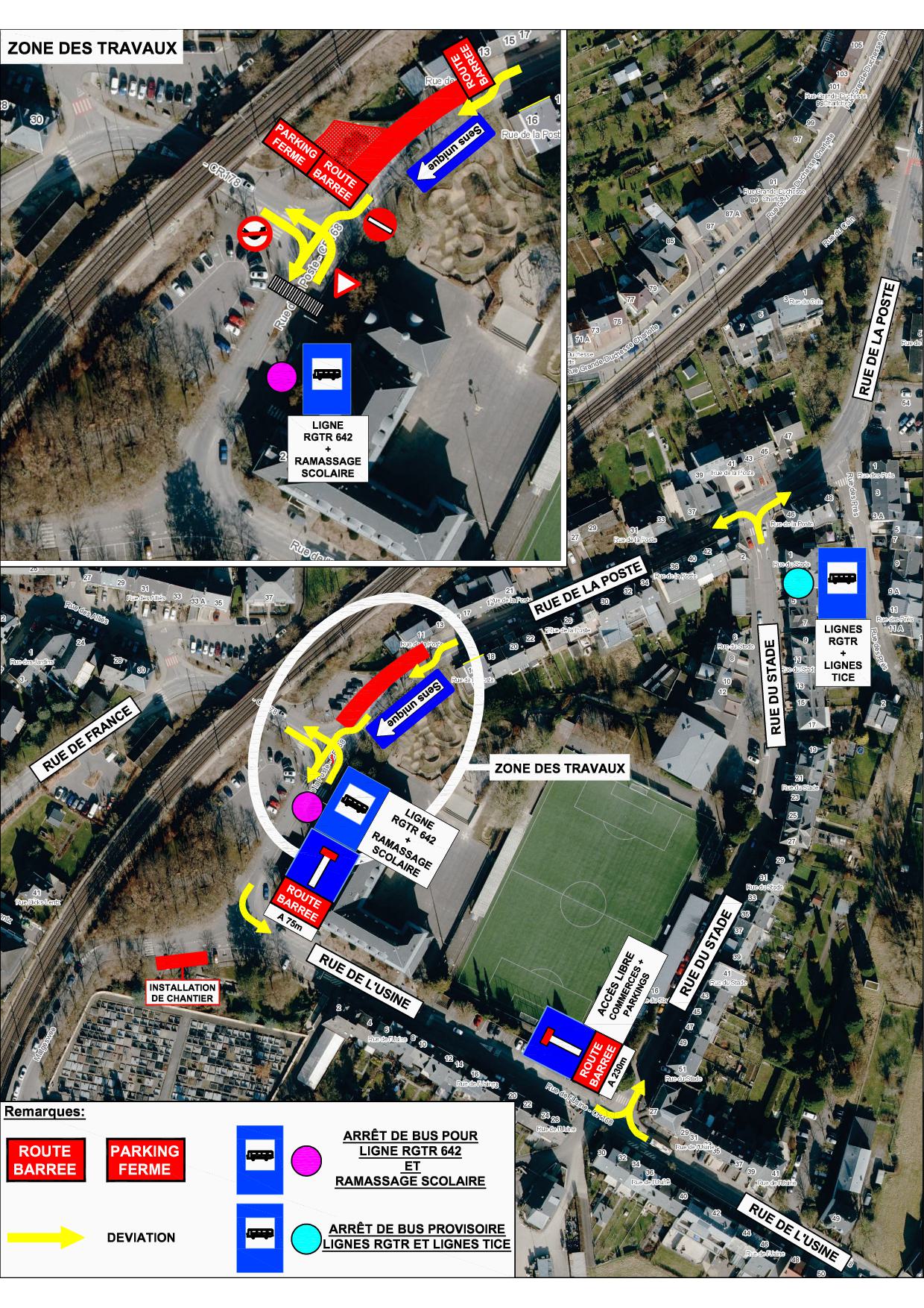 Tëscht der Rue des Alliés an der Maison sociale (Nr. 14, Rue de la Poste) gëtt eng Fuerspuer gespaart an dësen Tronçon als Sens-unique gereegelt. De Busarrêt Postschoul a Richtung Déifferdeng gëtt ausschliisslech vun der RGTR-Linn 642 souwéi dem Schoultransport ugefuer; ee provisoreschen Arrêt fir déi aner RGTR- an TICE-Linnen ass an der Rue du Stade virgesinn.