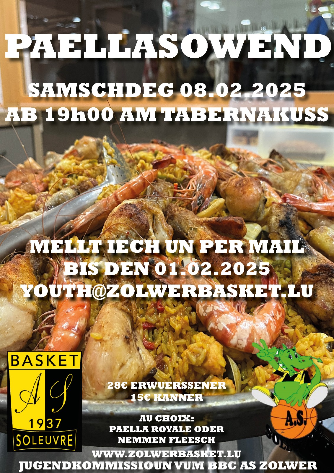 Paellasowend organiseiert vun der Jugendkommissioun vum Zolwer Basket. W.e.g virum 1. Februar umellen op youth@zolwerbasket.lu oder um 621 242 397. Merci am viraus.